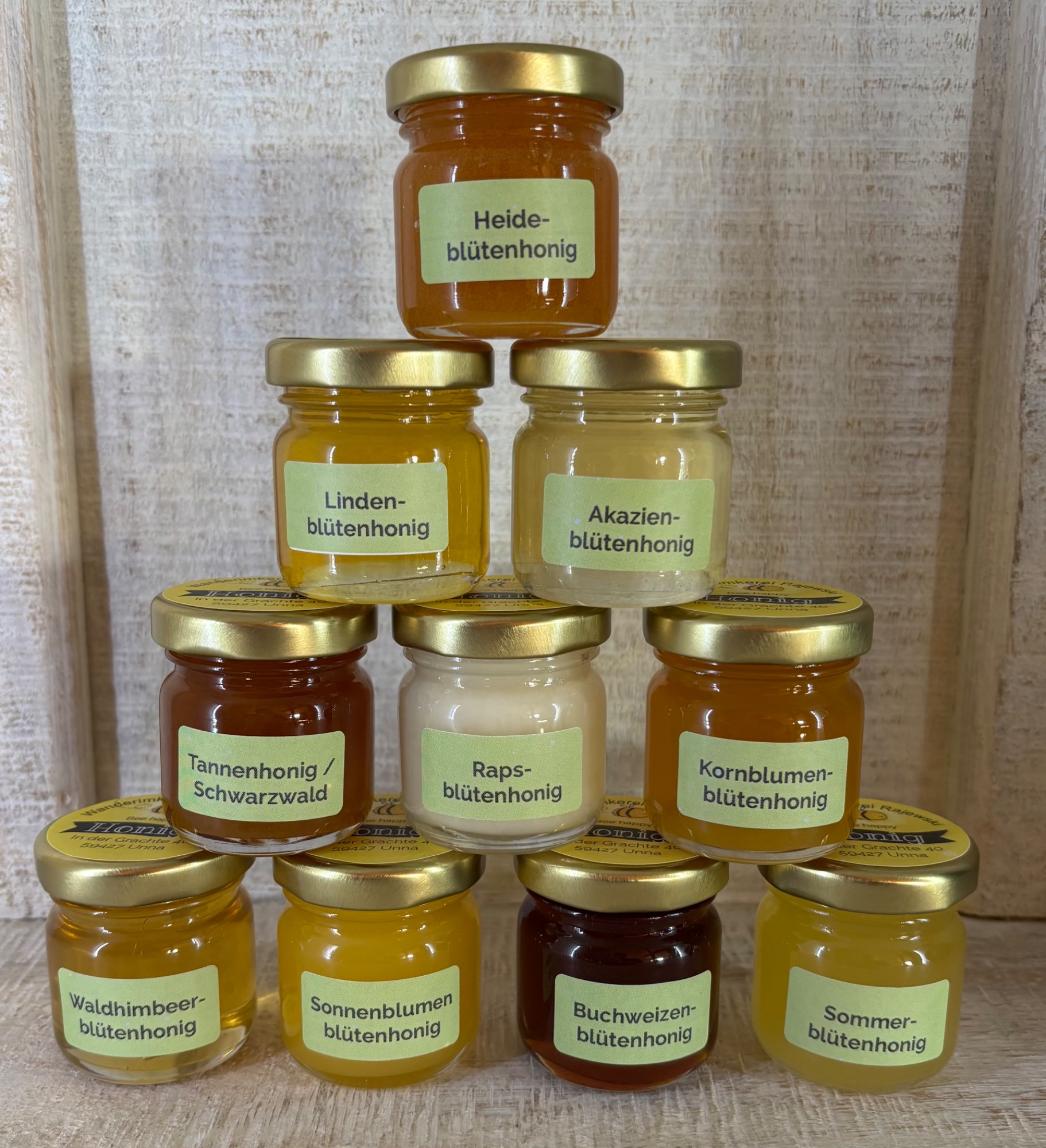 Raps- Weißdornblütenhonig von der Insel Fehmarn, den Rapsblütenhonig direkt aus Hemmerde und die Obstblüte aus unserem Nachbarort Dreihausen.