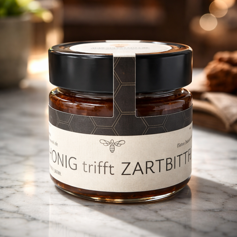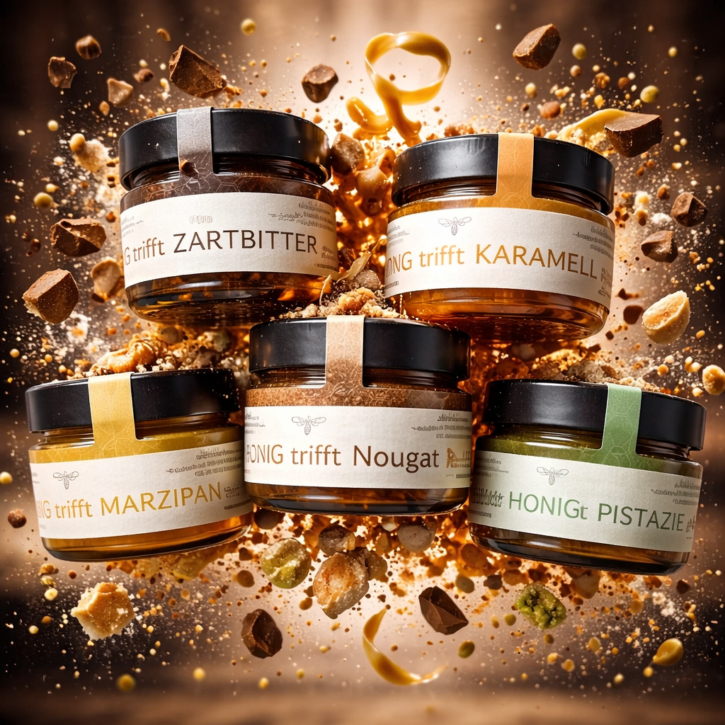 Wir haben unseren vielfach ausgezeichneter Akazienblütenhonig (zuletzt Gold in der Honigbewertung des Deutschen Imkerbundes 2025), mit feinstem Lübecker Marzipan, mit Pistazienmarzipan, mit edelem Nougat, mit herbem Salzkaramell und mit edeler Belgischer Zartbitterschokolade verfeinert.