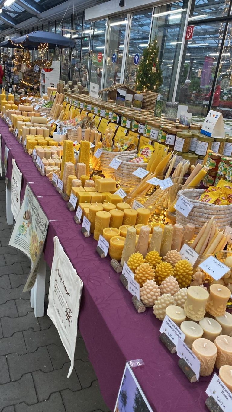 Mit allen unseren Honigen, jeder Menge Kerzen, Bienenkosmetik, Dekoartikel und vieles mehr.