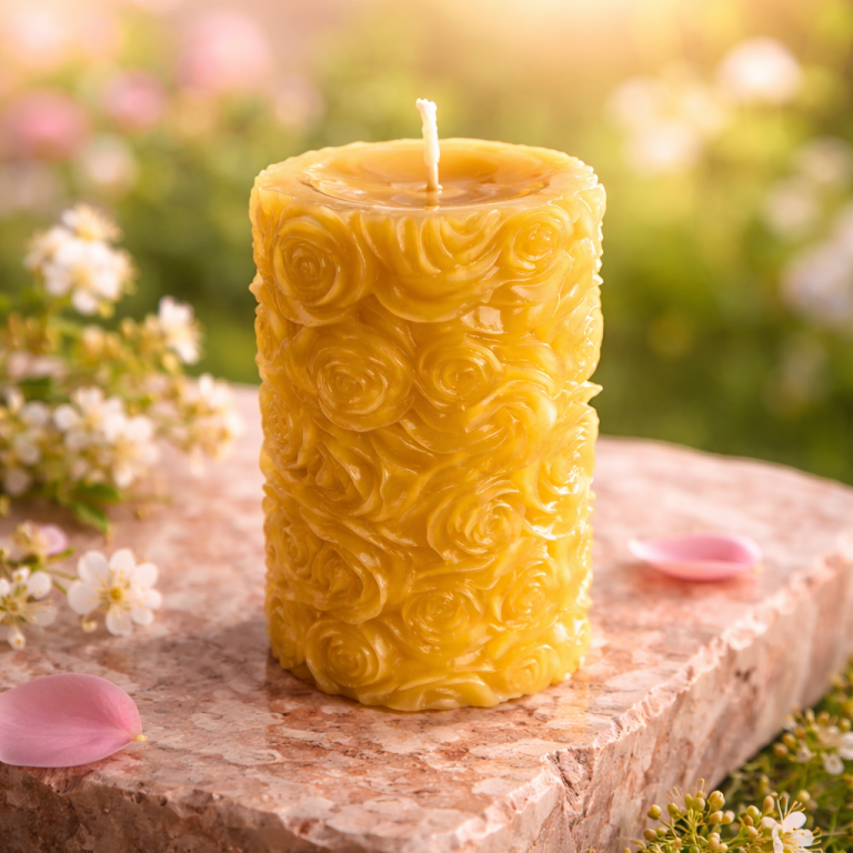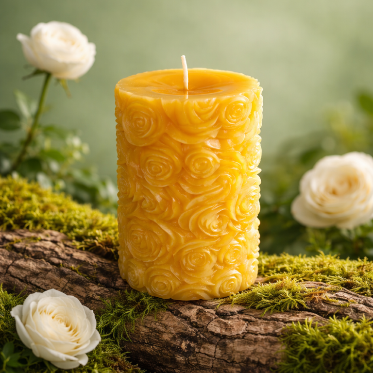 Vier wunderschöne Kerzen mit unterschiedlichen Blumenmotiven. Alle Kerzen sind 10 cm hoch und haben einen Durchmesser von 6 cm.